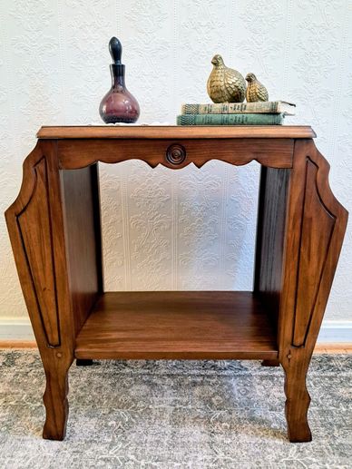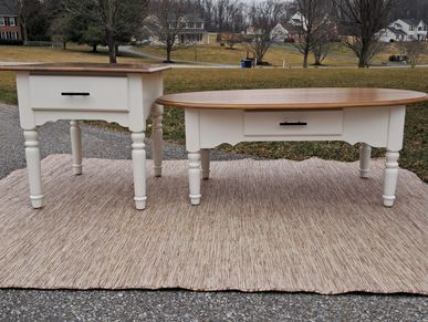 Refinished vintage youth bedroom set. Refinished in a creamy beige color with the original walnut stained tops. The tops are made of formica which makes them extra durable and easy to clean. The trim is oak. the rest of the construction is particle board with veneer. This is a heavy duty dresser set and will last for many more years. All the drawers have metal slides and work very smoothly(see video). The dresser drawers are very deep and provide a lot of storage. Measurements below. Tall Dresser: 34 w x 44.75 tall x 18 deep Wide Dresser: 40x30 x18 Desk: 40x30x18 Nightstand: 23.5x21.5x15