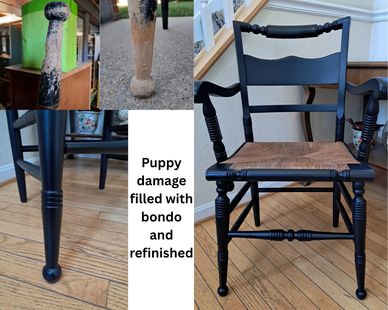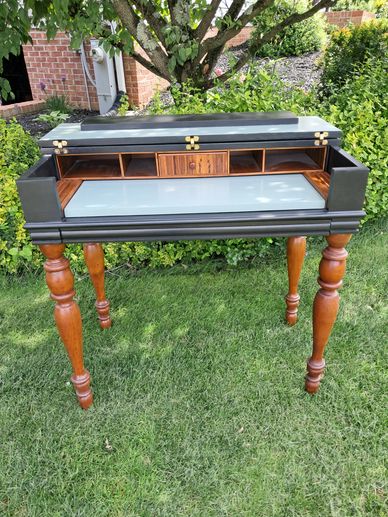 Refinished solid wood (not veneer) dining set for 4. Includes a glass top (not pictured) as well to protect the table top. The table top is stained in a natural wood finish. The base and chairs are a neutral gray with green undertones. This set can be incorporated into many different color schemes. The chair cushions have been reupholstered in a beautiful traditional jacobean print with an ivory background and hues of green, gray, yellow, brown, pink and blue. the diameter of the table is 42 inches, it is 30 inches tall.